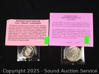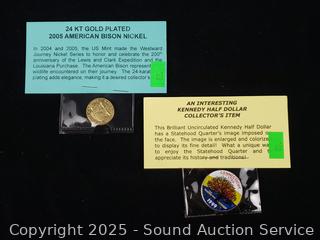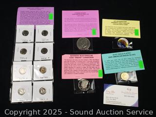 1981 Kennedy Gem Proof Half Dollar, 24kt Gold Plate 2005 Buffalo Nickel, 1999 Kennedy Half Dollar Painted in Connecticut Statehood Image, 1971 Eisenhower Dollar, (8) BU Roosevelt Dimes 1970-P to 1981-P. ATTN: We are not coin or currency experts or graders, please use your own judgement when bidding.