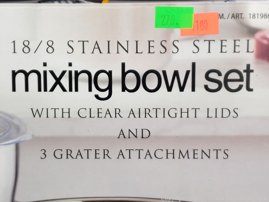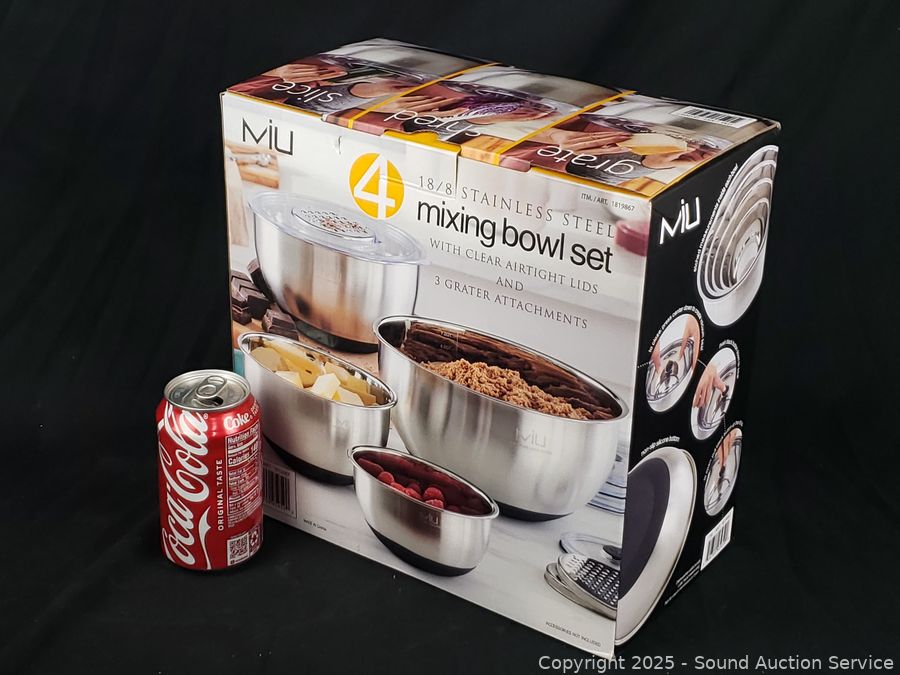 Lot #0276: 4pc Miu 18/8 Stainless Mixing Bowl Set w/Lids & 3 Grater Attachments