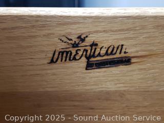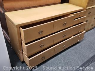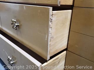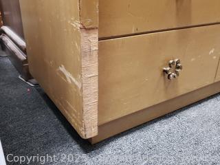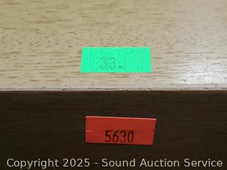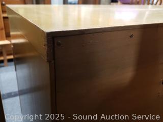 Appears to be all wood construction, dovetail joinery, veneer finish. Matches the next lot. Various wear to finish, damage to left edge. 31.5" H x 60.25" W x 19.5" D.