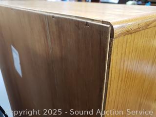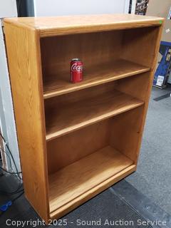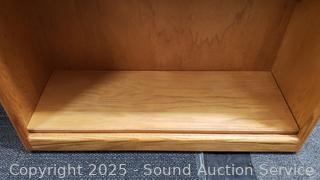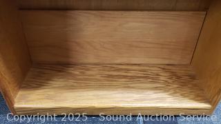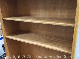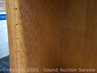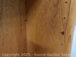 Missing 2 of the shelf pegs for one shelf. Appears to be all wood construction. 48.75" H x 35.25" W x 13" D.