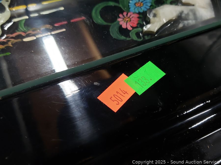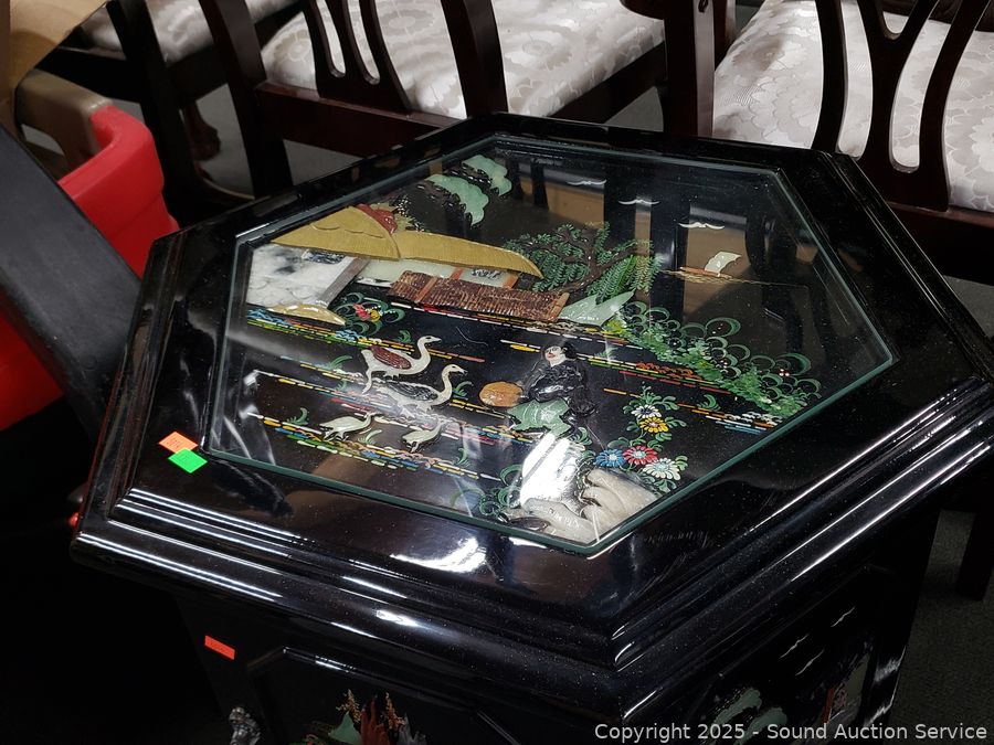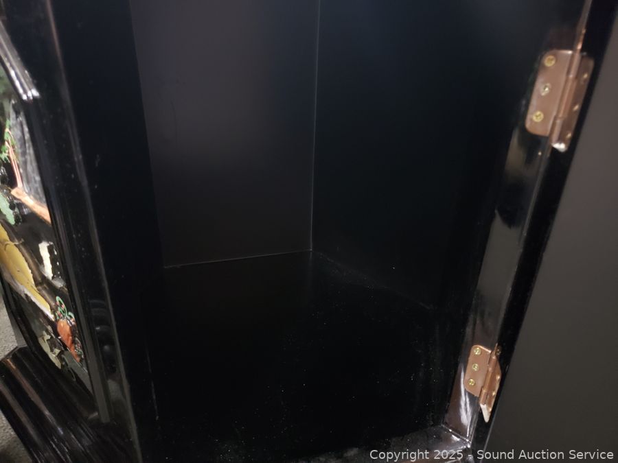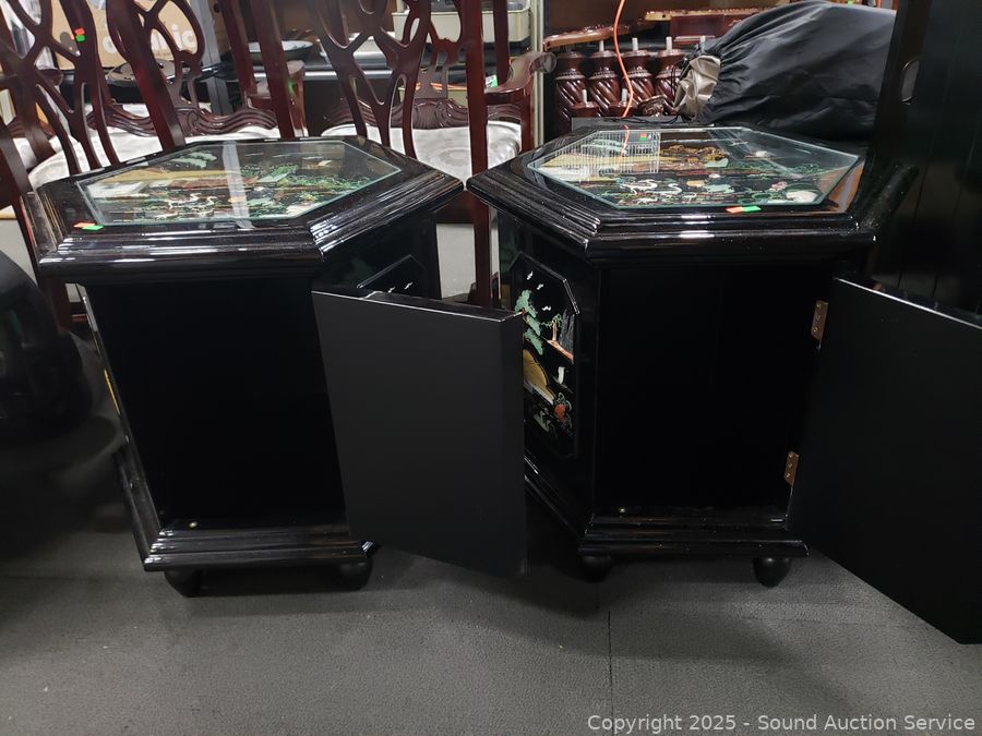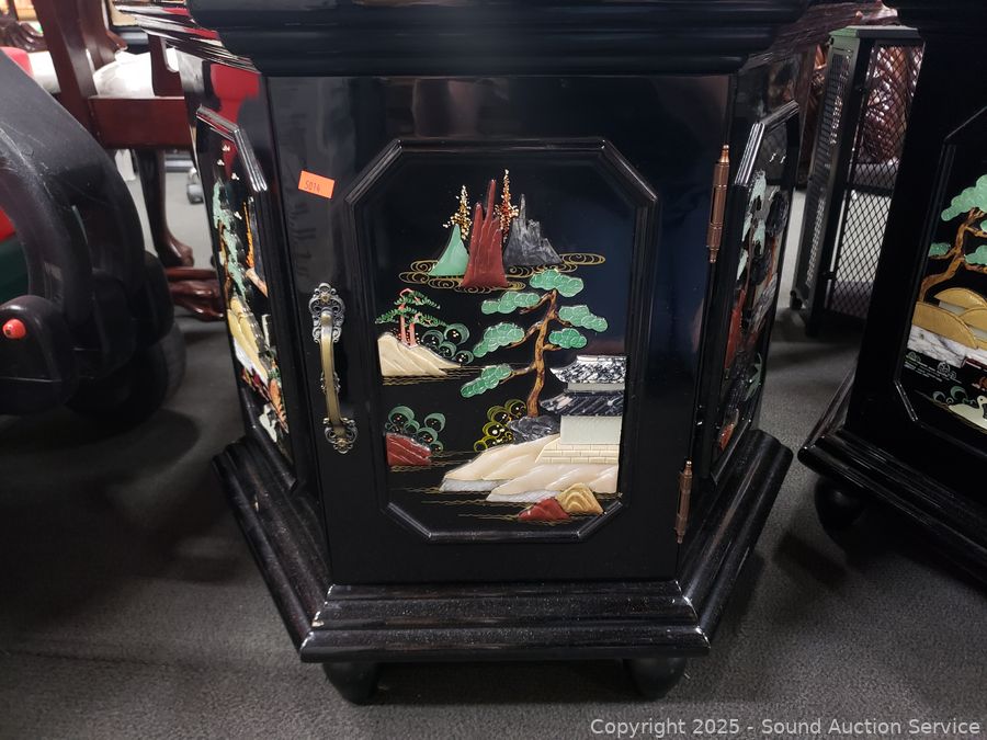 Lot #0133: Pair of Black Lacquer 3D Relief Asian Side Table Cabinets