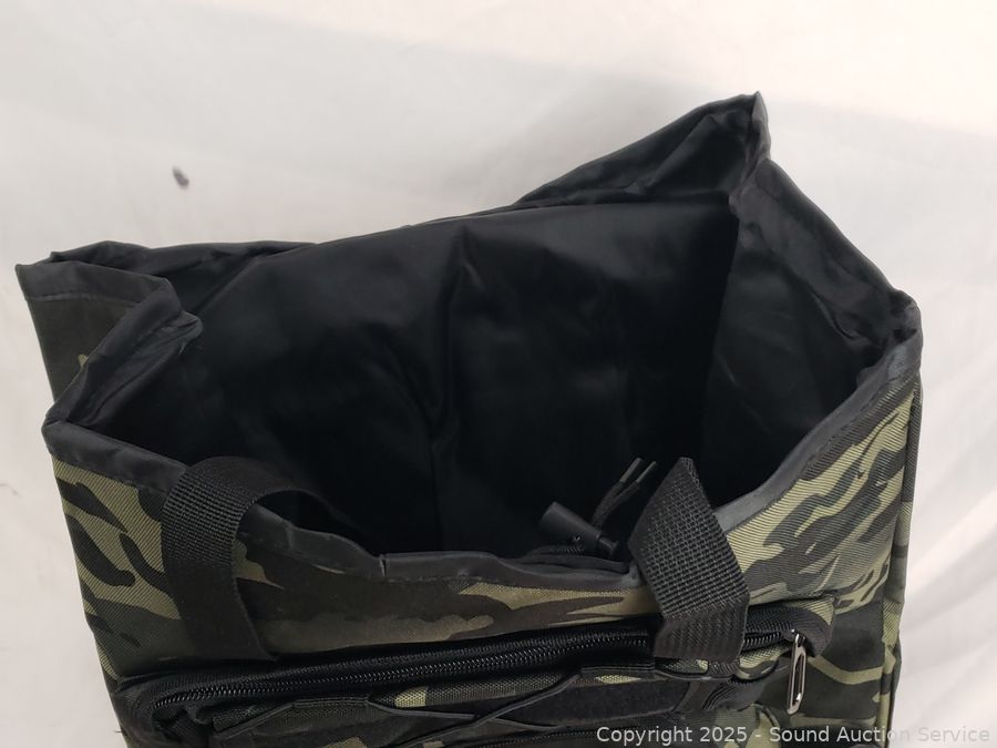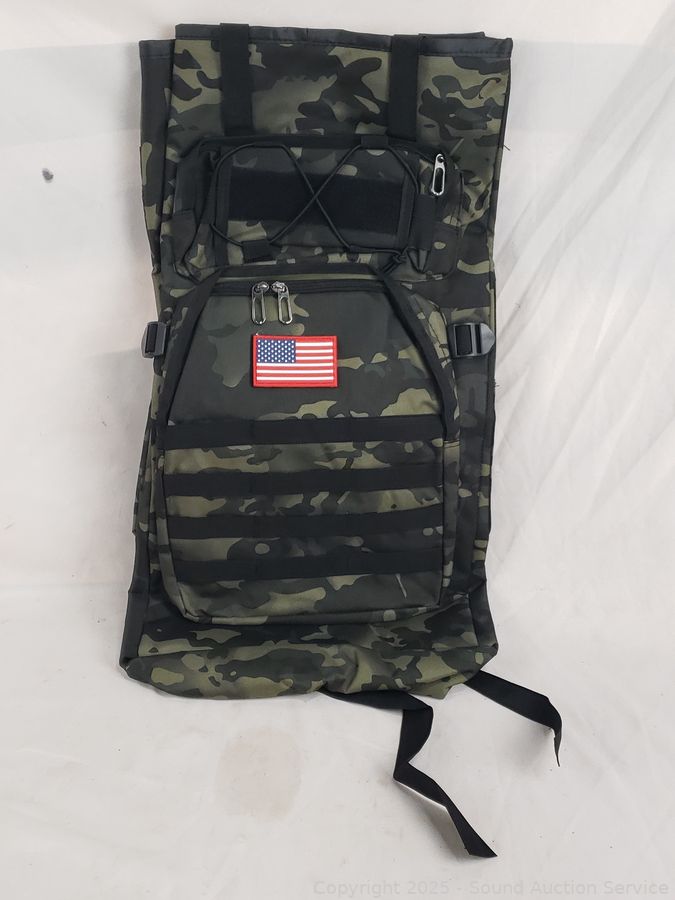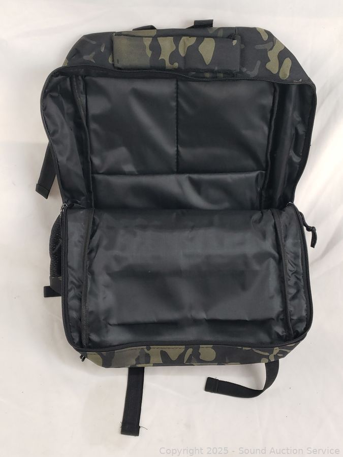 8" x 10" shoulder bag, 5" x 8" pouch, 18" x 14" & 25" x 14" backpacks. Appear new, unused.