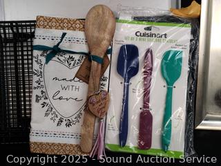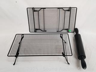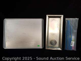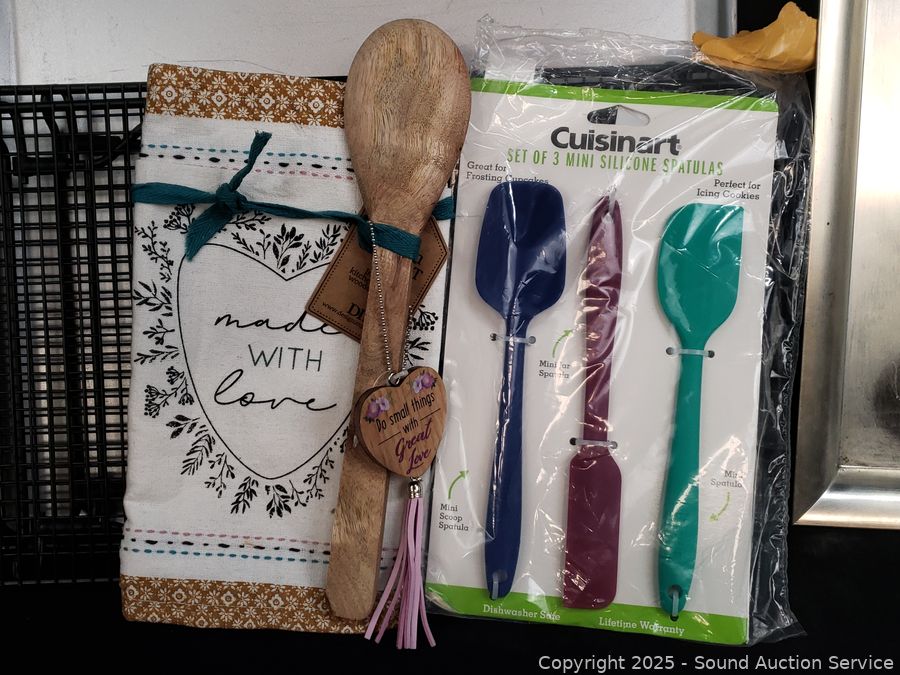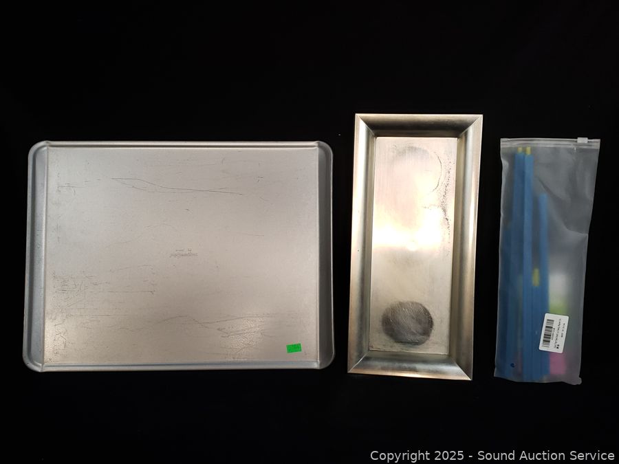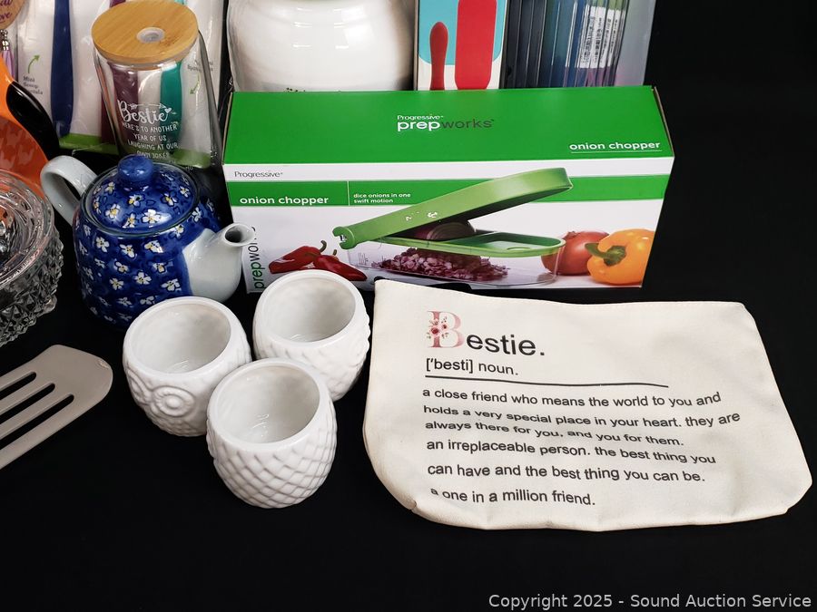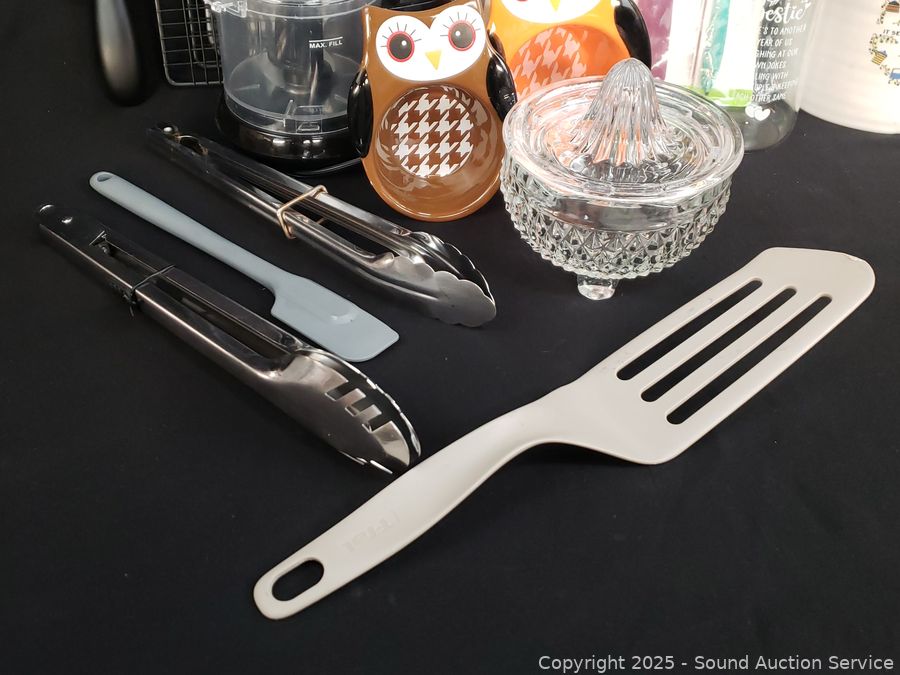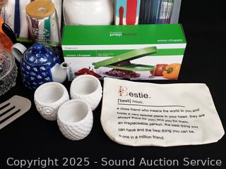 Pampered chef baking sheet, 2 racks, utensils, coffee grinder, onion chopper, glass pitcher, juicer, etc. Refer to photos for lot contents, more details.