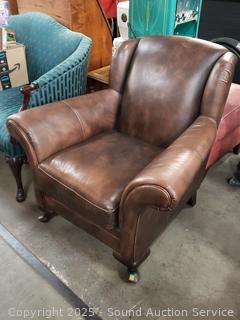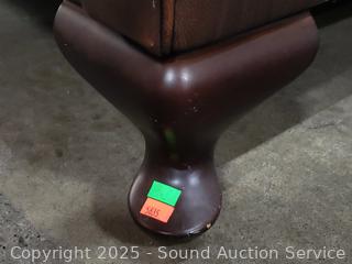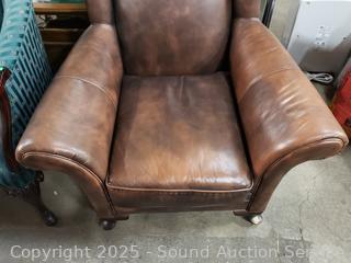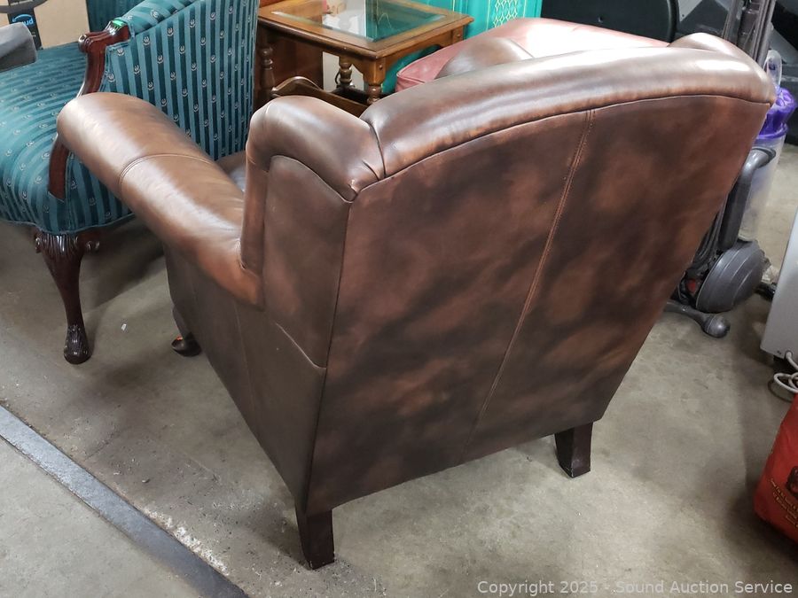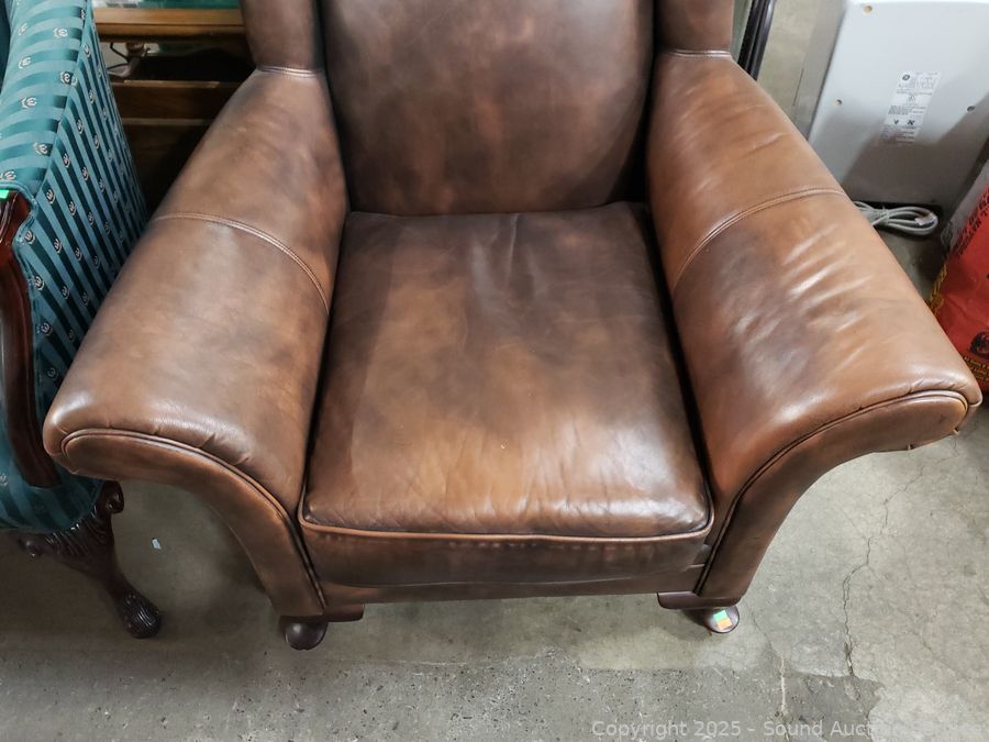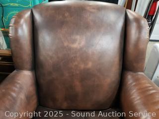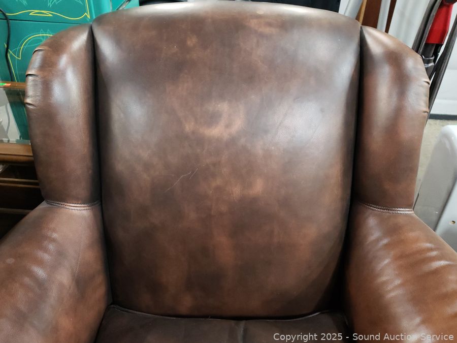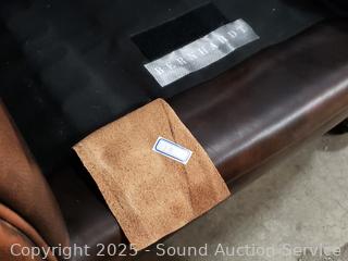 Genuine leather. In great cosmetic condition. Very comfy! 35" H x 38" W x 18" to seat.