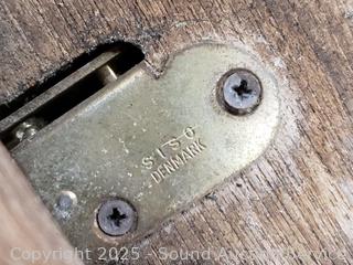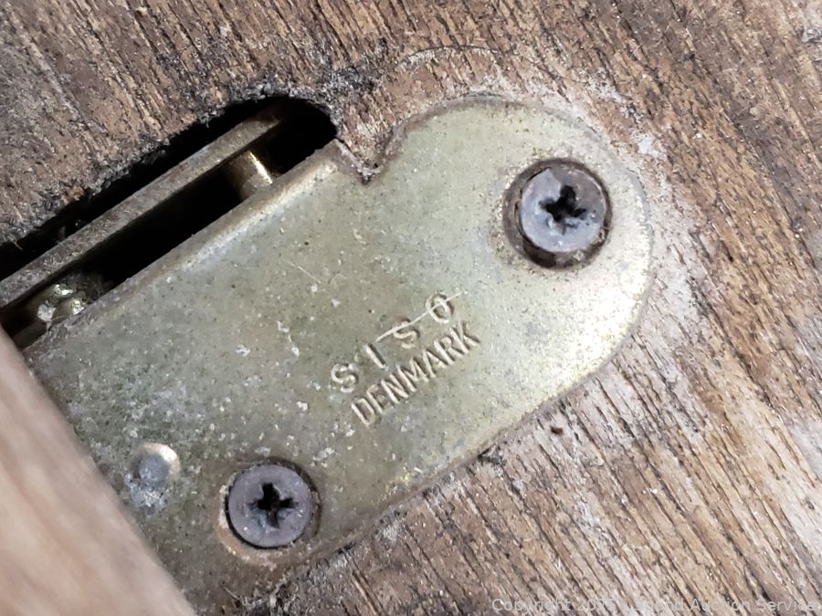 22" butterfly leaf built into table. Comes with a cover. Some weathering wear, overall good condition. Made in Denmark. 29" H x 78.5" x 50".