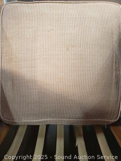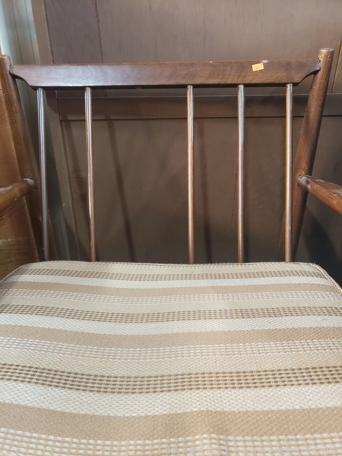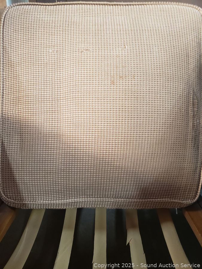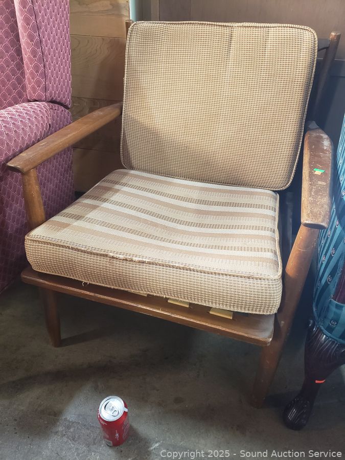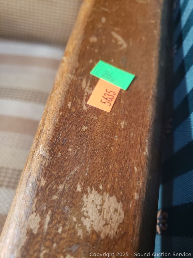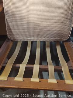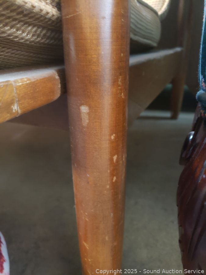Has some issues, leather supports for seat is very stretched and brittle, should probably be replaced before use, some damage to fabric of chair pads, various scuffs, scrapes to wood finish. 29.5" H x 27" W x 14" to seat.