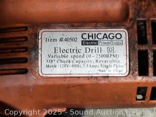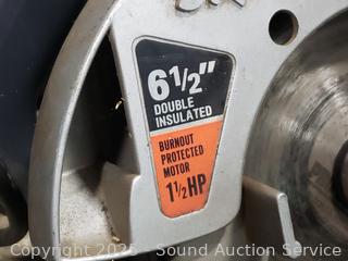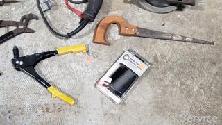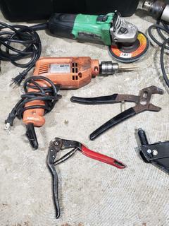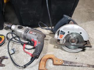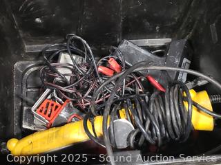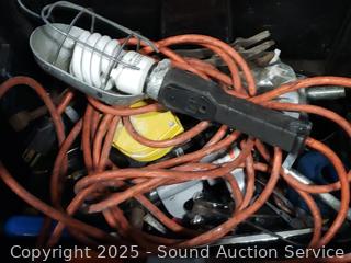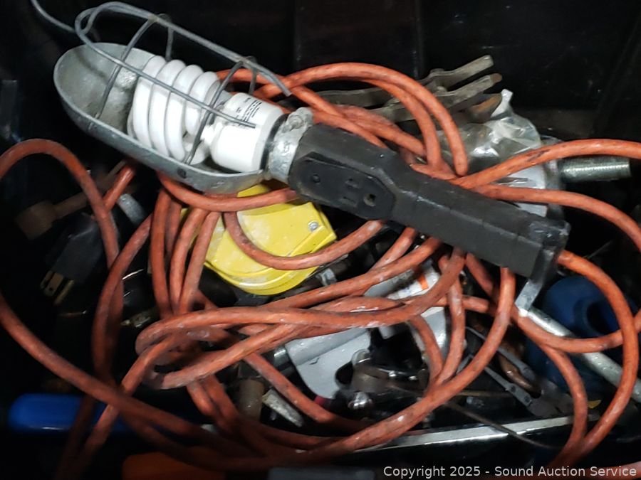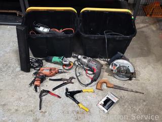 Zippo hand warmer, drop light, hand saw, wrenches, puller, circular saw, 1/2" drill, angle grinder, etc. Power tools all work. Refer to photos for lot contents, more details. 14" H x 14.5" x 20" totes with lids.