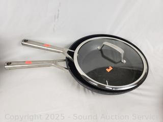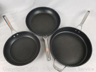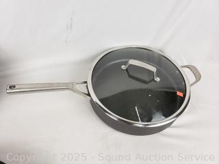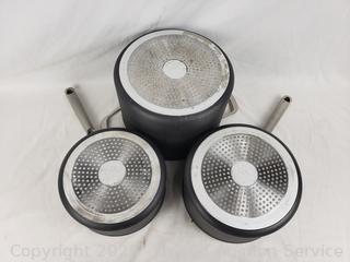 2.5qt, 3.5qt saucepans, 10", 12" skillets, 12" frypan, 6.5qt boiling pot. Some scuffs, signs of wear from use.