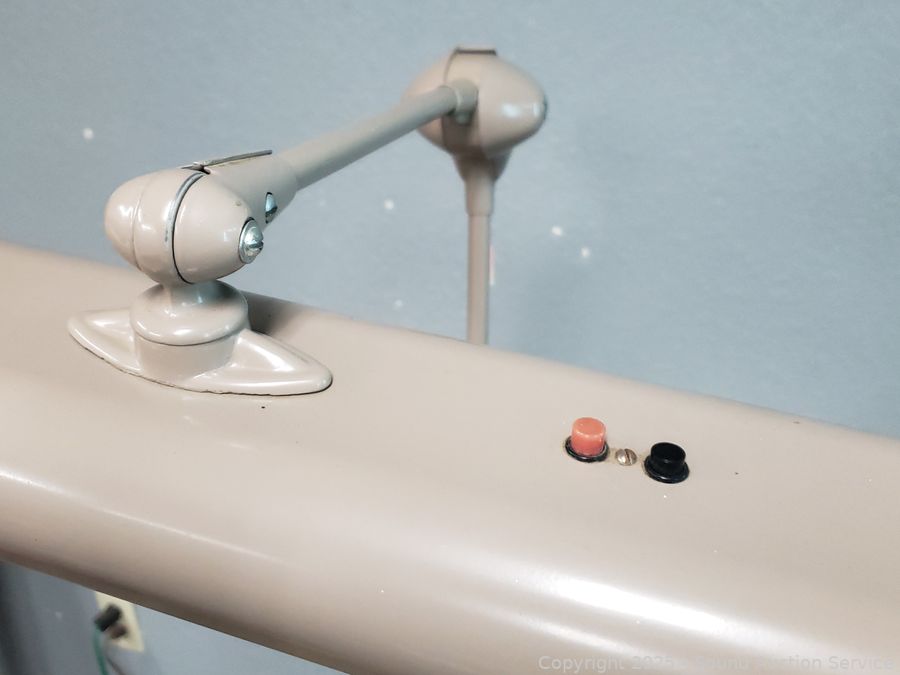 Approx. 34" arm, 40" tall. Appears to be functioning as intended. Some scuffs, wear to finish.