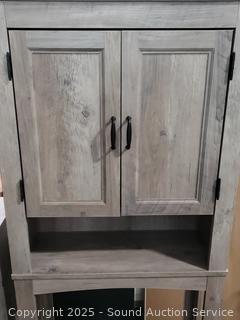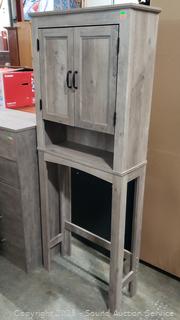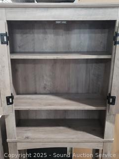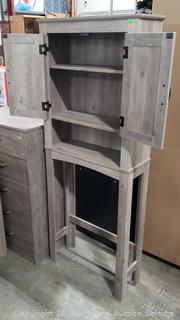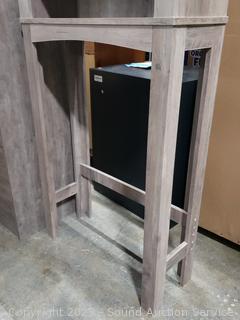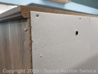 Particleboard construction, wood grain finish. Don't see any issues. 65.75" H x 25.25" W x 9.5" D.