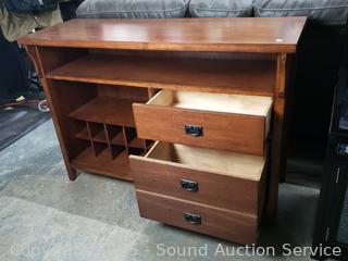 3 drawers with roller drawer guides, cord holes in the back. Approx. 36" H x 52" W x 18" D. Some minor wear to finish.