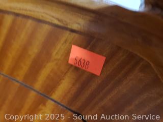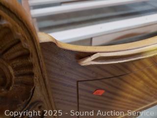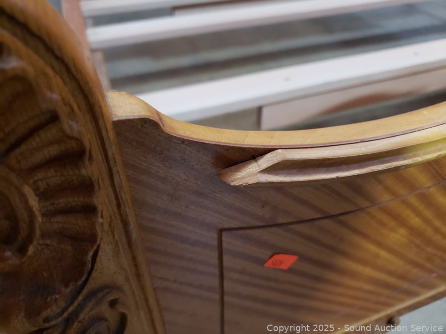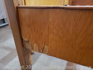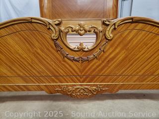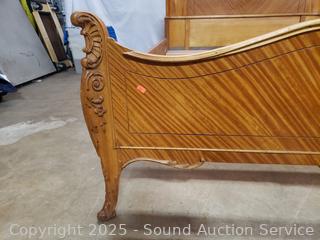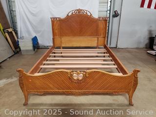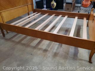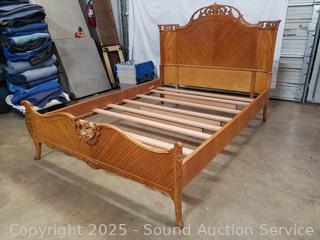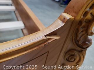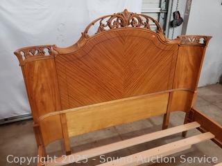Carved accents, curved headboard with slats. Approx. 21" to 50" H x 56" W x 72" long rails. Some dings, wear to finish, some damaged spots. Refer to phtoos for more details.
