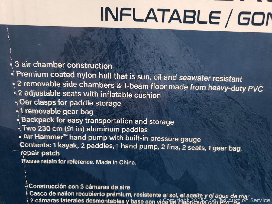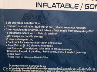 Kayak looks new, does not have the 2 seats that are supposed to come with it. Does have 2 inflatable pads to sit on. Has bag pump & 2 paddles.