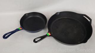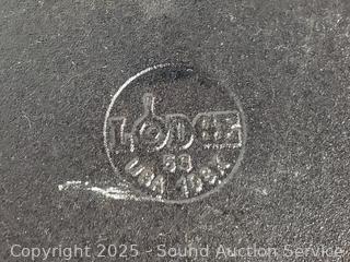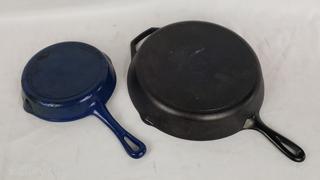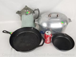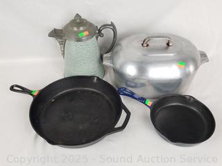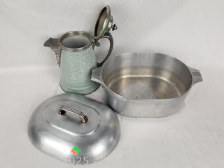 Wagner Ware 13" roaster, Pewter Enamel pitcher, 8" unmarked & lodge 12" cast iron skillet. Refer to photos for lot contents, more details.