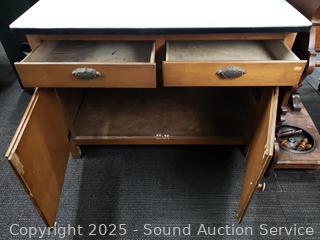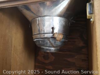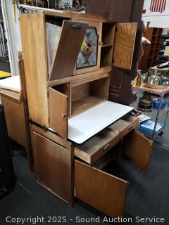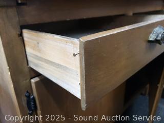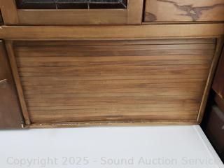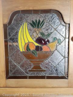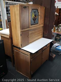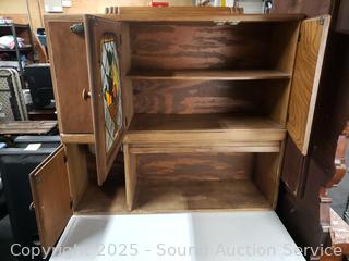 Pullout metal tabletop, flour mill insert. Lower cabinet doors are loose and sagging. Stained glass in the middle doors. 68" H x 40" W x 26" D.