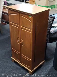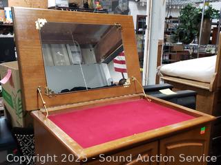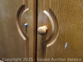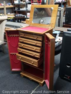 Left door is missing the pull knob. Jewelry racks in the doors. Some scuffs, wear to finish. 41" H x 22" W x 15" D.