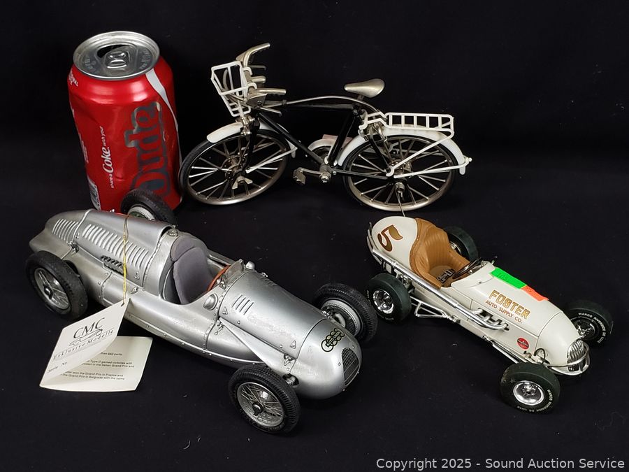 Lot #0105: 2 Diecast Cars & Bicycle