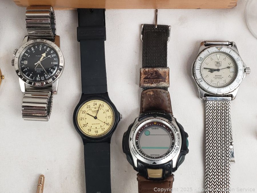 Glycine Airman 24hr Automatic Mechanical, appears to be functioning as intended. 2 Casio, Heuer & other, untested, various wear. Refer to photos for lot contents, more details.