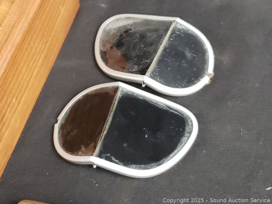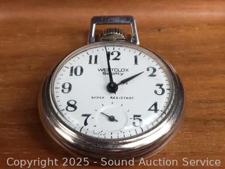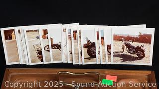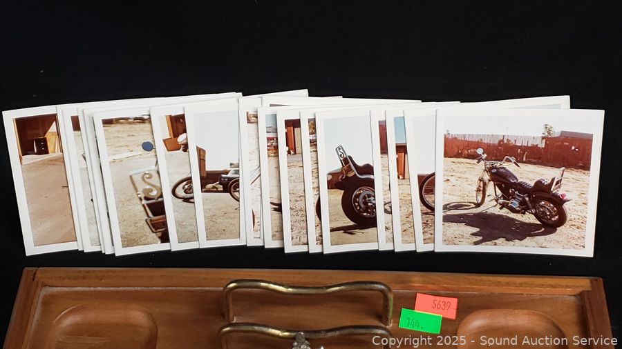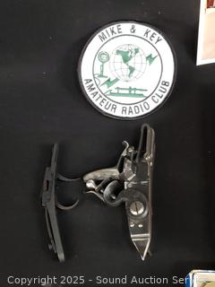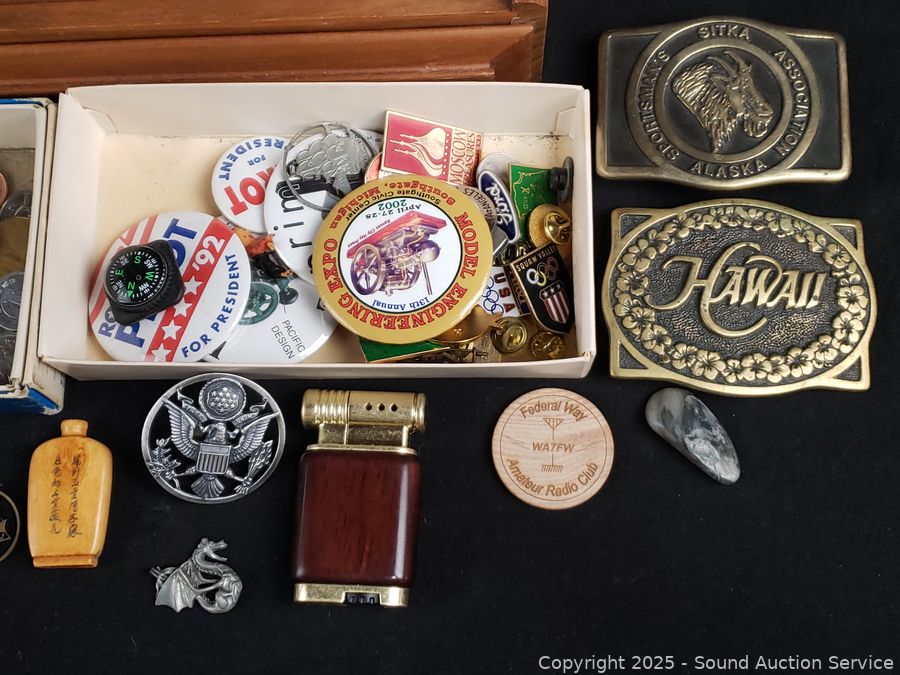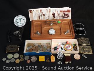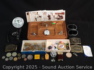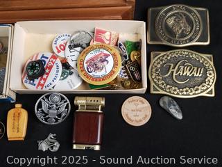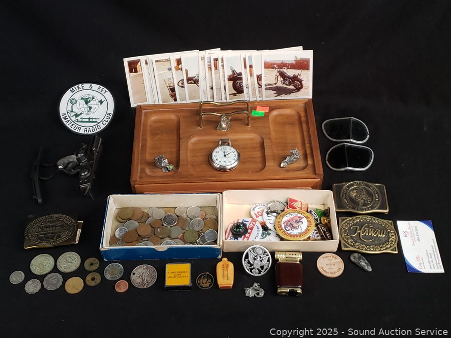 Black powder firing mechanism, appears to be in functional condition. Westclox mechanical pocket watch (works), pins, buttons, vintage photos for a Harley motorcycle, belt buckles, men's jewelry box. Refer to photos for more details.