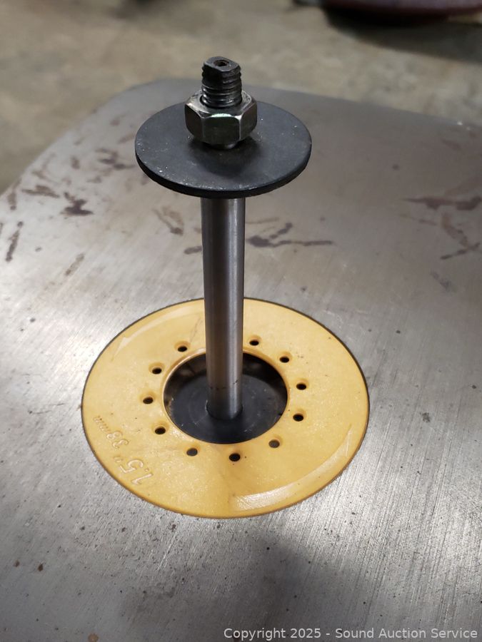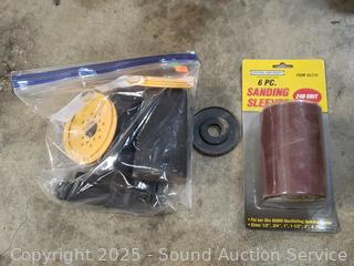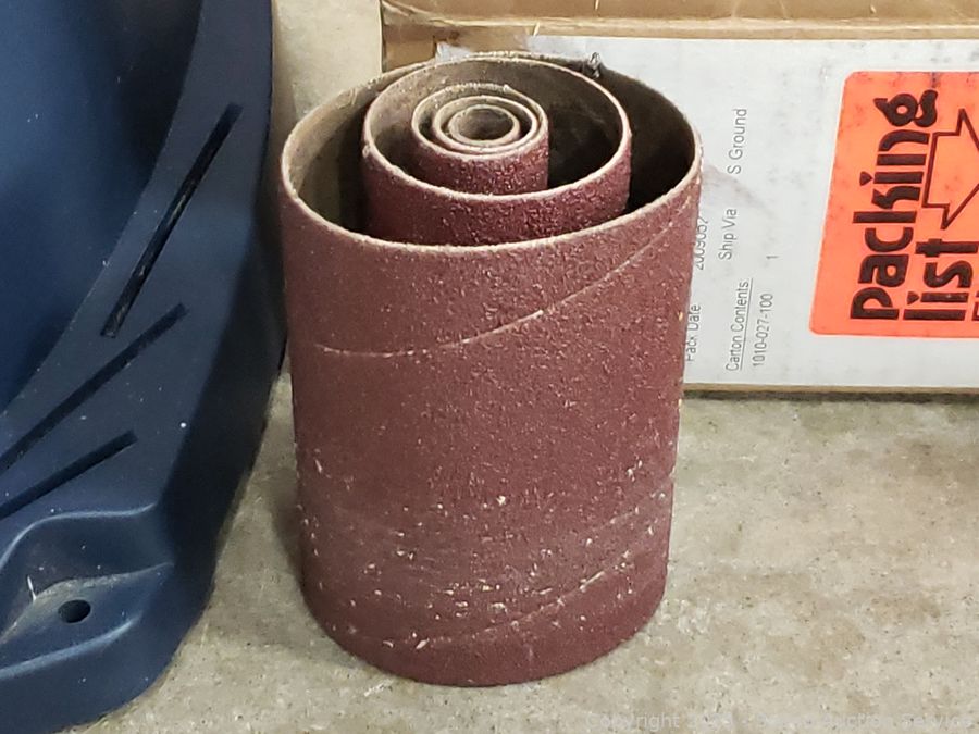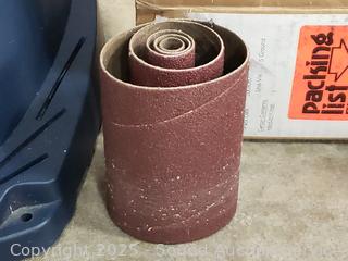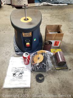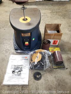 Sanding sleeve, discs, manual. Various wear from use. Missing some sleeves/spindle pieces. Appears to be functioning as intended.