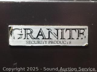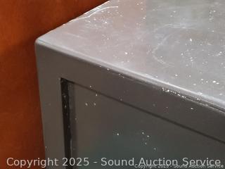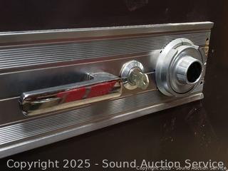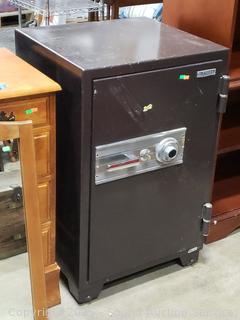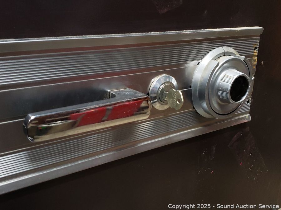 Comes with key. unsure of the combination, currently taped in place, opening with key. Also has a locking drawer inside. Approx. 37" H x 23" W x 21.5" D. Various wear to finish.