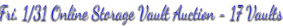 02/07/25 Fri. 1/31 Online Storage Vault Auction - 17 Vaults BIDDING NOW! Lots Start Closing 5:30 PM Friday, Jan. 31st. Preview: Online & by Appointment only, contents of vaults may not be gone through. Payment Methods: $100 deposit required at the close of the auction upon winning a vault, refunded after removal of contents. Credit Cards on file will be run after the close of the auction. Buyers Premium: 20%. Removal: Please check in at main building first when picking up your items. 48hr removal, 9:AM-5:30PM Sat. 02/01 & Tue. 02/04. Closed Sunday's & Monday's. All items must be removed no later than 5:30 PM (PT) on Tue. 02/04. All items that are not picked up during the allotted pickup period will be forfeited!!! |